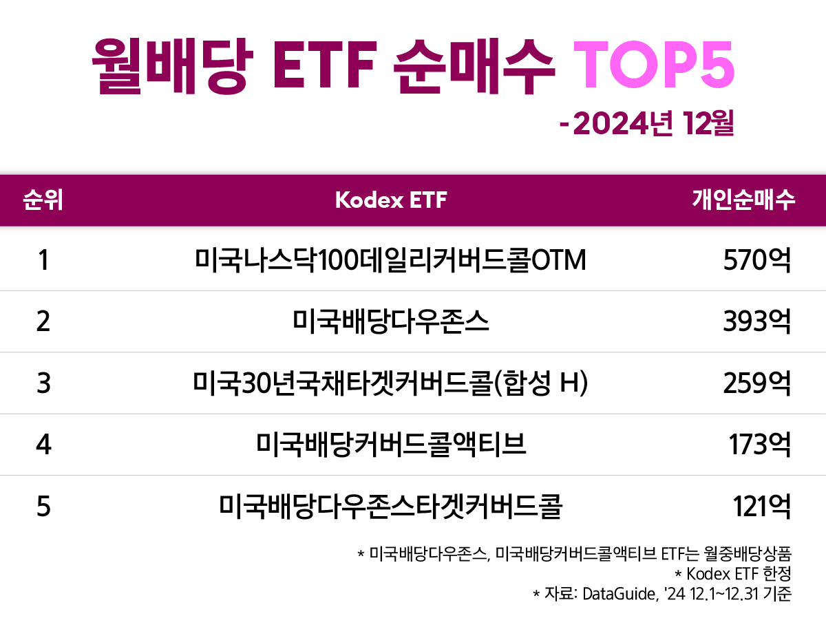 위에서 월배당 ETF들의 분배금 지급 현황을 살펴봤는데요! 그렇다면, 12월 월배당 ETF 중에서 개인이 가장 많이 사들인 ETF는 과연 무엇이었을까요? 순위를 통해 알아보겠습니다.