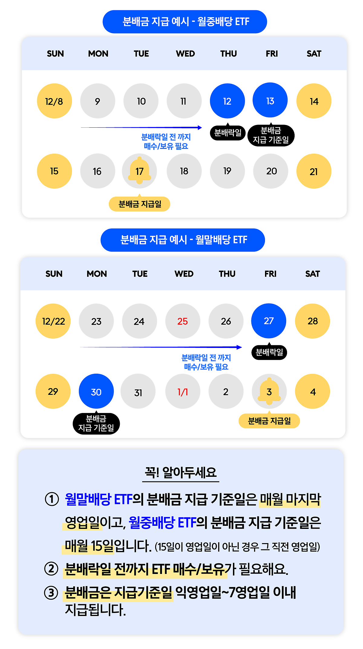 이렇게 월배당 ETF의 분배금 순위, 그리고 순매수 순위까지 알아보았는데요. 월배당 ETF에 투자가 처음이신 분이나 분배금 지급 시기와 지급받기 위한 매수 시기가 궁금하신 분들은 아래 예시를 참고해 주세요!